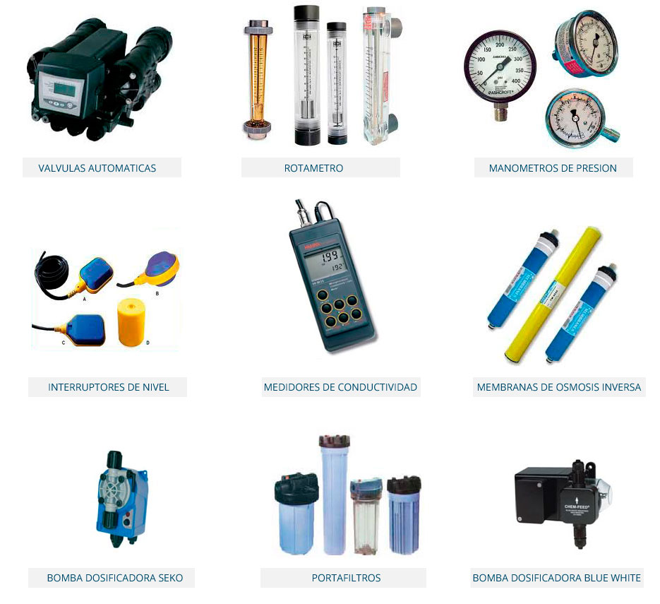 · Rotámetros · Bombas dosificadoras · Medidores de conductividad · Medidores de cloro & Ph · Válvulas de control automático · Porta filtros de acero · Elementos filtrantes · Resinas de intercambio · Tanques de fibra · Válvulas Automáticas · Manómetros de presión |